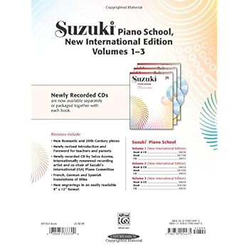 The New International Edition of Suzuki Piano School, Volume 1 includes French, German and Spanish translations performed by internationally renowned recording artist Seizo Azuma. Now the book can be purchased . While the music selections in Volume 1 remain the same as the earlier edition, the spacious new engraving with minimal editing generally keeps only one piece per page. Instruction material in many pieces from Volume 1 has been removed in lieu of right-hand studies at the top of the page and left-hand studies at the bottom. Tempo markings are now included on many pieces. Titles: "Twinkle, Twinkle, Little Star" Variations (Shinichi Suzuki) * Lightly Row (German Folk Song) * The Honeybee (Bohemian Folk Song) * Cuckoo (German Folk Song) * Lightly Row (German Folk Song) * French Children's Song (French Folk Song) * London Bridge (English Folk Song) * Mary Had a Little Lamb (American Nursery Song) * Go Tell Aunt Rhody (Folk Song) * Au Clair de la Lune (J. B. Lully) * Long, Long Ago (T. H. Bayly) * Little Playmates (F. X. Chwatal) * Chant Arabe (Anonymous) * Allegretto 1 (C. Czerny) * Goodbye to Winter (Folk Song) * Allegretto 2 (C. Czerny) * Christmas-Day Secrets (T. Dutton) * Allegro (S. Suzuki) * Musette (Anonymous).